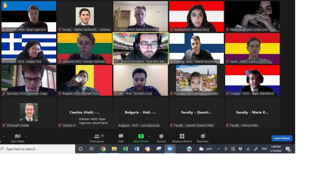 The Global Model European Union (GLOBALMEU) is a simulation of the European Union organized in partnership with universities worldwide. The simulation meets in Brussels in even years and New York in odd years. The 2022 edition was organized virtually between 13-15 January due to the Covid-19 pandemic and reunited participants from fourteen universities.