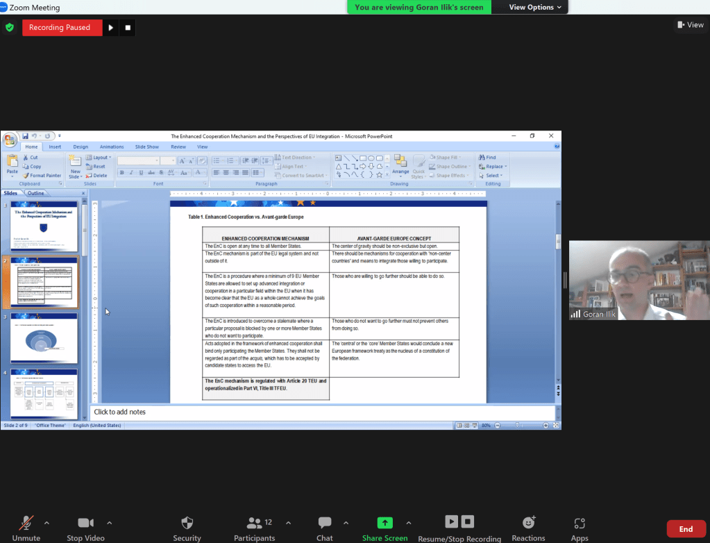 Prof Goran Ilik addressed the issue of EU decision-making instruments used by the European Union to advance integration. The lecture focused on the Enhanced Cooperation Mechanism(EnC) instituted as a flexible tool under the Amsterdam Treaty and further extended by the Nice and Lisbon Treaty to new areas such as the CFSP and defence sphere.